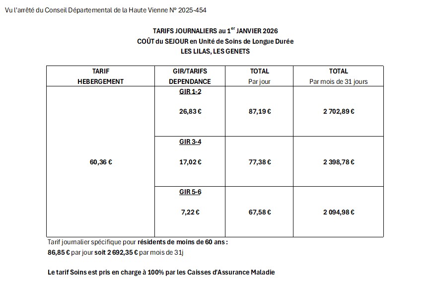 Les frais de séjour restant à charge du résident sont fixés annuellement par décision du Conseil Départemental de la Haute-Vienne et intègrent un tarif hébergement et un tarif dépendance (l’allocation personnalisée autonomie peut cependant prendre en charge les groupes iso ressources 1, 2, 3,4, du tarif dépendance) ; il restera ainsi réellement à la charge du résident le tarif hébergement + le GIR 5/6 du tarif dépendance, soit :