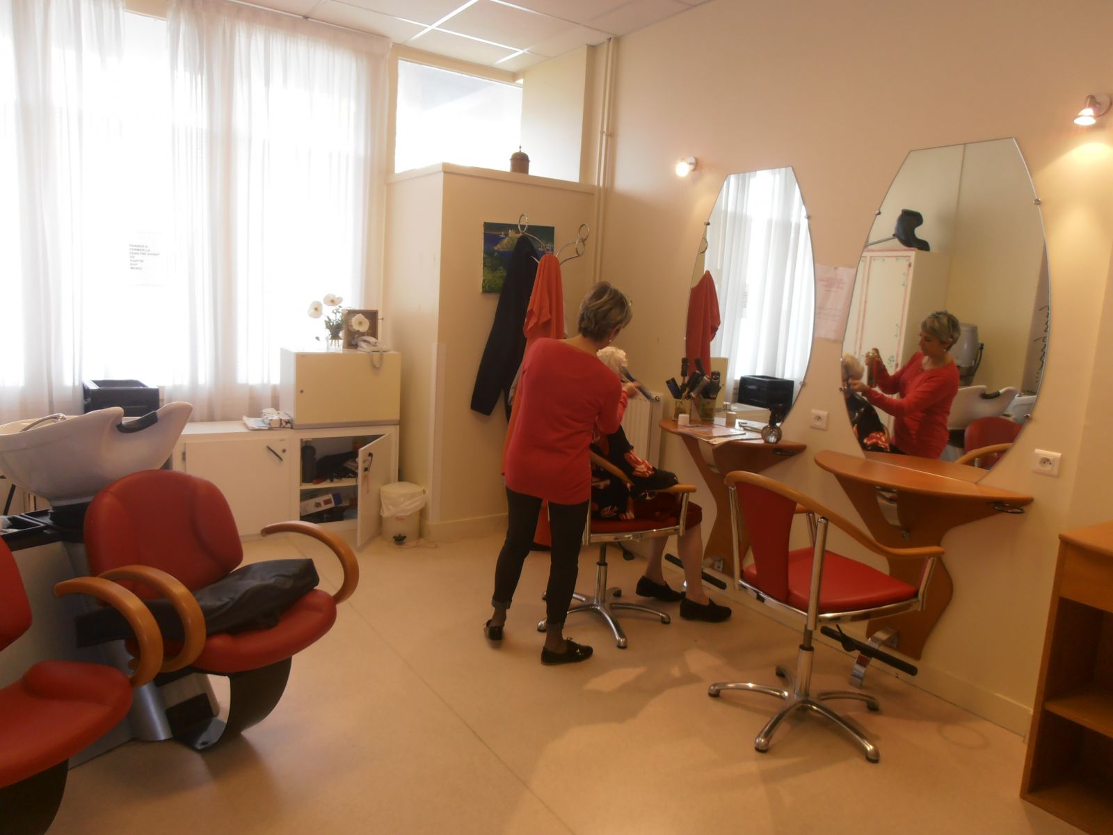 Certains agents de l’établissement, formés à la coiffure, peuvent également pratiquer des coupes, des brushings et des mises en pli, dans le cadre des soins quotidiens.